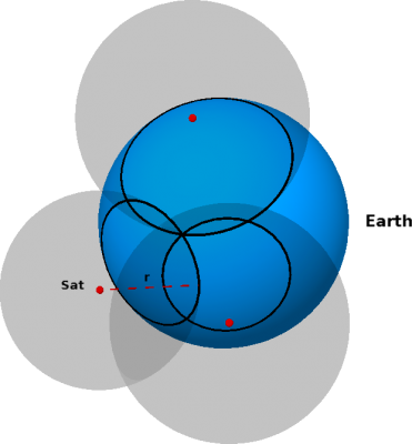 Un dispositivo gps deduce la propria posizione geografica utilizzando la posizione nota di alcuni satelliti ed il tempo impiegato dal segnale emesso dal satellite per raggiungere il dispositivo. Come esempio consideriamo il caso di un dispositivo GPS D che riceve segnali da un singolo satellite Sat e, come ulteriore semplificazione, assumiamo che la Terra sia una sfera perfetta (senza montagne). Il segnale trasmesso da Sat contiene numerosi dati, quelli più rilevanti per il nostro esempio sono due: (1) quello che identifica Sat e la sua posizione rispetto la Terra e (2) il tempo t0 nel quale il segnale è stato trasmesso da Sat. Quando D riceve questo segnale, usando il proprio orologio interno, determina il tempo t1 in cui ha ricevuto il messaggio e quindi il tempo t=t1-t0 impiegato dal segnale per raggiungerlo. Poiché la velocità di trasmissione v è nota, D può determinare la sua distanza r = vt da Sat. D può perciò dedurre che si trova in un cerchio dato dall’intersezione della sfera che rappresenta la Terra e la sfera di raggio r con centro nella posizione di Sat (si veda la figura che segue).